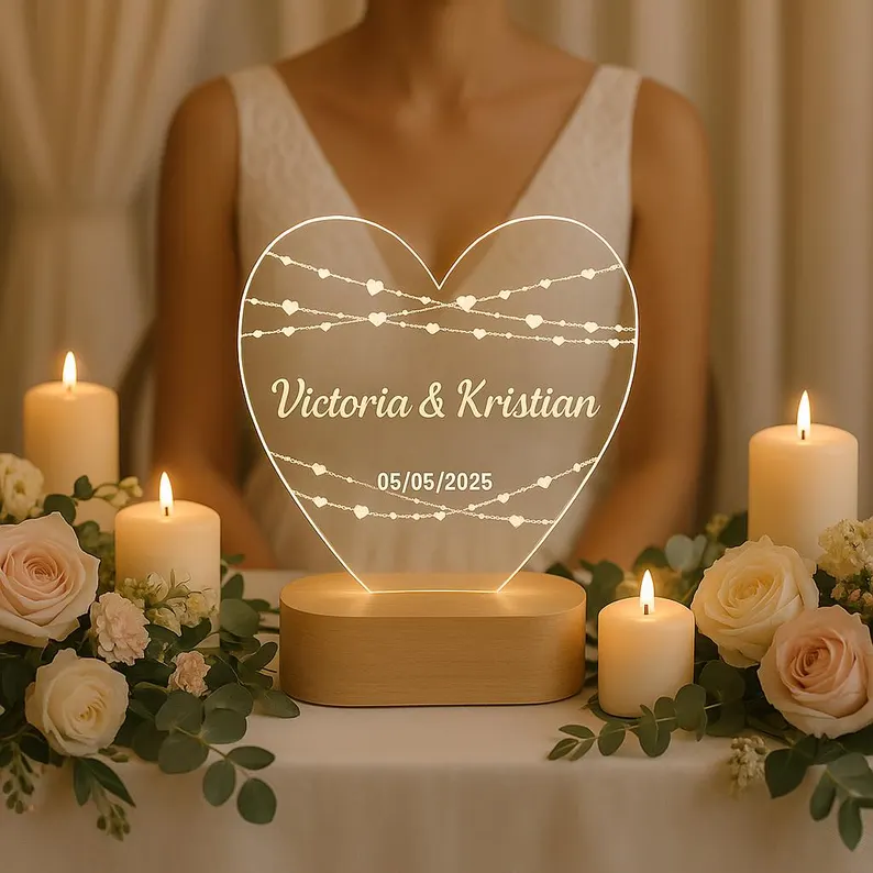 Make your special moments shine with our Customized Heart-Shaped LED Acrylic Lamp. Designed with elegant heart patterns and customizable engravings, this lamp beautifully displays the couple’s names and a meaningful date, making it a timeless keepsake.