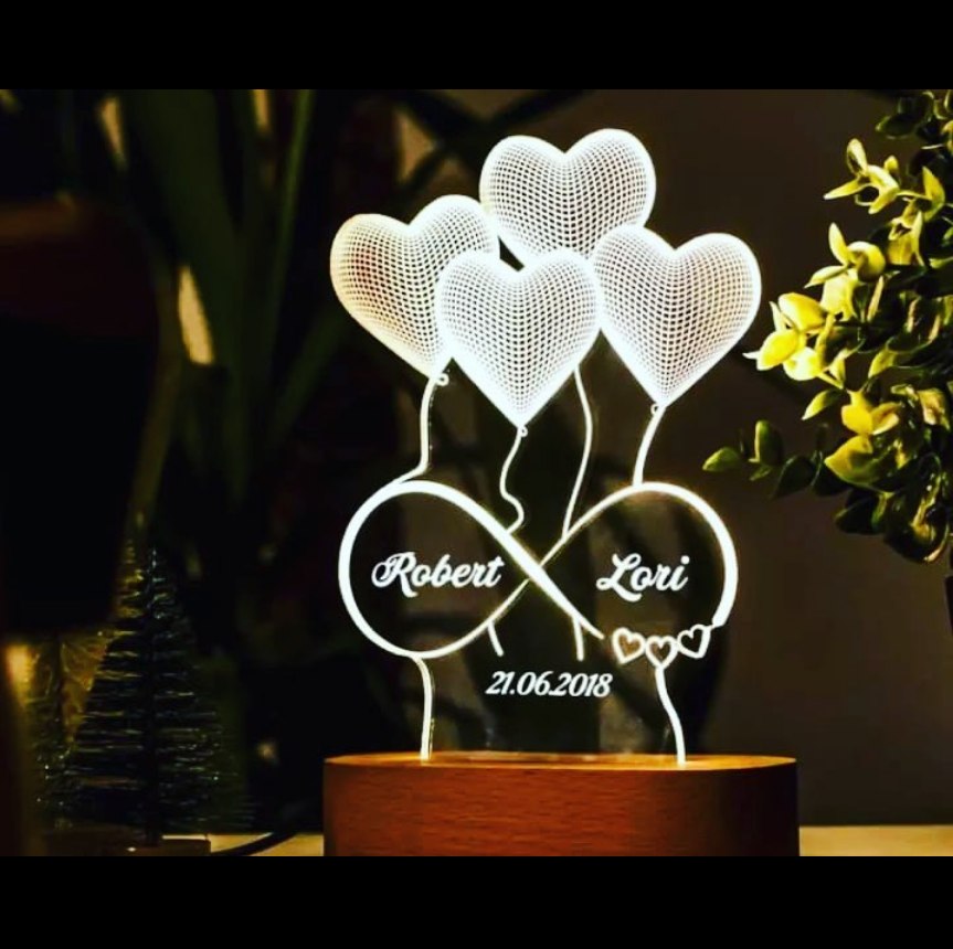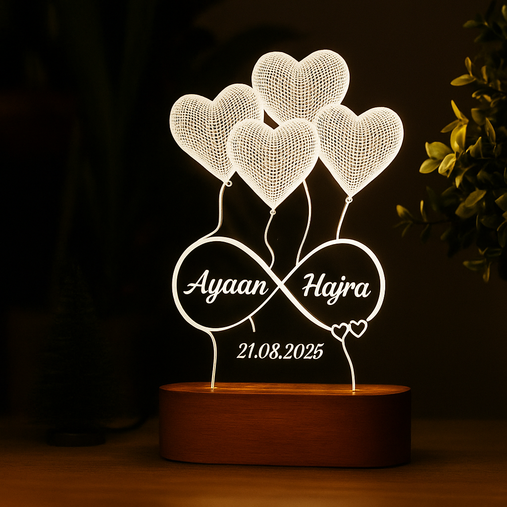 Our Personalized 3D Illusion LED Lamp is crafted from clear acrylic and mounted on a premium wooden base. When lit, it creates a magical 3D floating effect with heart balloons and an infinity symbol — a timeless reminder of your love story.